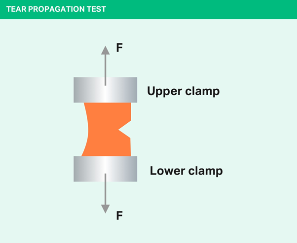 The test setup for the tear propagation strength test is shown in the diagram below.