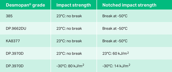 The Charpy impact test is a simple and rapid test that can be used to conduct a comparative assessment of different materials. It is employed, among other purposes, to study the effect of changes in formulation conditions, compounding conditions and injection molding conditions on test specimens. In the Charpy impact test, specimens are subject to a loading configuration similar to that in the three-point bending test and, if they are sufficiently brittle, they will fracture. Notched specimens must be used to achieve fracture in ductile materials. The test can be carried out within a temperature range of –40°C to +23°C. Compared with other materials, Desmopan® attains very high impact strength and notched impact strength values. On account of the elastic properties of TPU, there is no breakage above the glass transition temperature (Tg). The following table shows a number of characteristic values for reinforced Desmopan® grades: