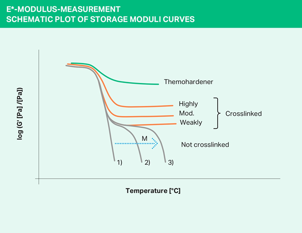 Figure 2 shows the storage moduli curves for different polymer types. If the storage modulus falls to just slightly above the glass transition temperature and remains at this level up to the decomposition temperature, i.e., the material remains comparatively rigid over the entire temperature range in which it is used above the glass transition temperature, the material can be assumed to be an extremely tough, crosslinked, short chain polymer.