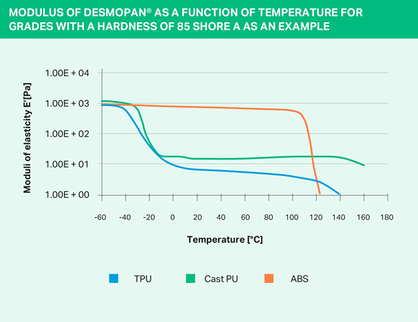 In Figure 4 below, the modulus of elasticity of a selected Desmopan® grade is compared to that of a cast PU and a hard thermoplast (ABS).