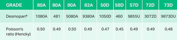 The selected grades of Desmopan® demonstrate Poisson’s ratios between 0.45 and 0.5. A Poisson’s ratio of 0.5 means that the volume remains constant under tensile or compressive stress. A Poisson’s ration slightly below 0.5 means that the material experiences a slight increase in volume when subjected to tensile stress and a slight decrease in volume when subjected to compressive stress.