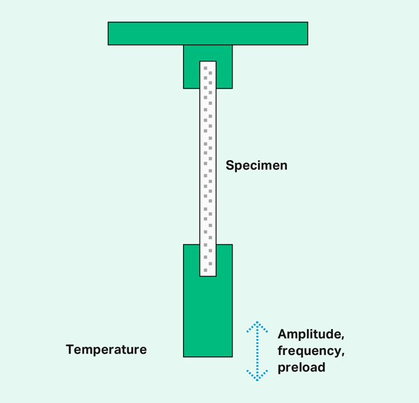 In DMA (analysis of the tensile modulus/complex modulus of elasticity), a very small fluctuating mechanical sinusoidal stress is applied to the test specimen (which is under a constant preload, which may be dependent on the storage modulus), with variation of temperature over time. This setup results in deformation of the specimen in phase. The parameters measured are the force amplitude, deformation amplitude and phase displacement Δ φ between the force and deformation signals. The preload is used to keep the specimen sufficiently tensioned at the time of negative dynamic deformation amplitude. The DMA yields the complex modulus of elasticity of the specimen. A prerequisite here is that the specimen is not subject to stress outside the linear elastic region (Hooke’s region); see Figure 1. The specimens may react in one of three ways: