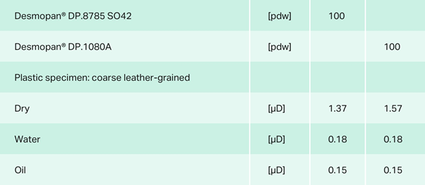 For plastics, it is virtually impossible to obtain a meaningful assessment of friction behavior, since, in practice, friction processes are accompanied by effects that cannot be comprehensively defined. The friction behavior of Desmopan® products is determined by their hardness and surface finish. Friction increases as the hardness of the material decreases. “Stick-slip” effects thus develop with flexible products. Friction behavior is also dependent on the surface against which the friction is tested, as well as on the condition of the surface (e.g. wet, dry). The following table provides an impression of the friction behavior of a leather-grained Desmopan® specimen paired with polished steel based on the requirements in DIN-EN-ISO-8295 (further details see below):