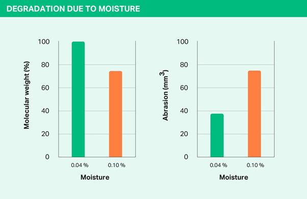 This method, as described in ISO 4649, can be used to test the resistance of surfaces and coatings to wear or abrasion. Two rollers covered with emery paper rub against the surface of a rotating specimen. By varying the grain size and the contact pressure of the emery paper, different degrees of loading can be simulated. The abrasion is specified in mm³, with an allowance for the density of the test specimen. Generally, data obtained from this test can only be applied to parts in the real world if the test conditions tally with those encountered in operation. Otherwise, this test method is intended to provide a comparative assessment of different materials. Together with other TPUs, Desmopan® counts as one of the most abrasion-resistant elastomeric materials under actual service conditions. Its abrasion loss is frequently a fraction of other materials, particularly when compared with other TPE classes. Desmopan® polyester grades that are frequently employed in abrasive applications display an abrasion loss of no more than 20 to 30 mm³. For the sports shoe industry, additional special grades in the S043 series offer particularly low abrasion loss. If processed carefully, these grades can even cut abrasion loss down to between 15 and 20 mm³. TPU is considered to be the elastomeric material that offers the highest resistance to abrasion under the conditions encountered in practice. This requires the granules to have been dried sufficiently prior to processing.