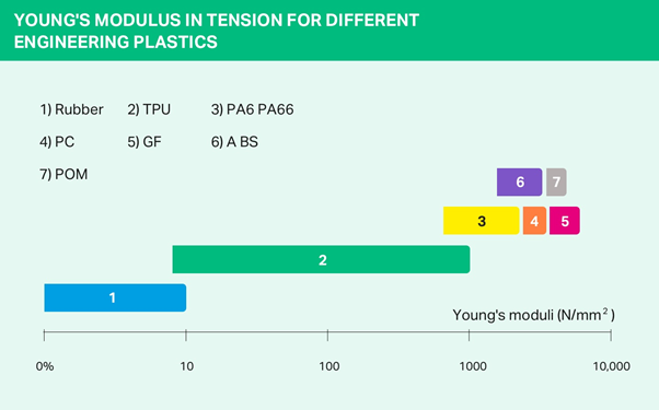 The graphic below shows the Young’s modulus range for thermoplastic polyurethanes and RTPU compared to other engineering plastics.